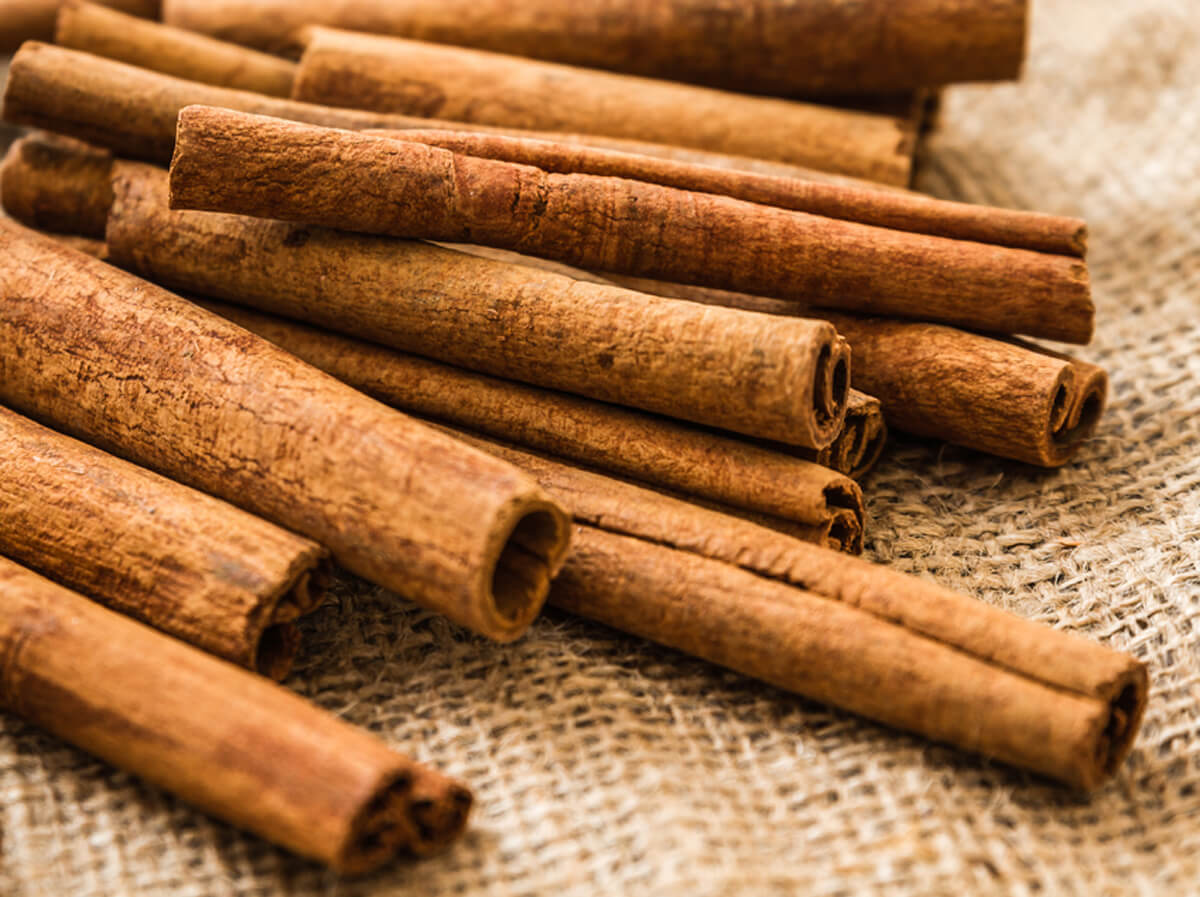 Cinnamon sticks in straw basket on a linen napkin