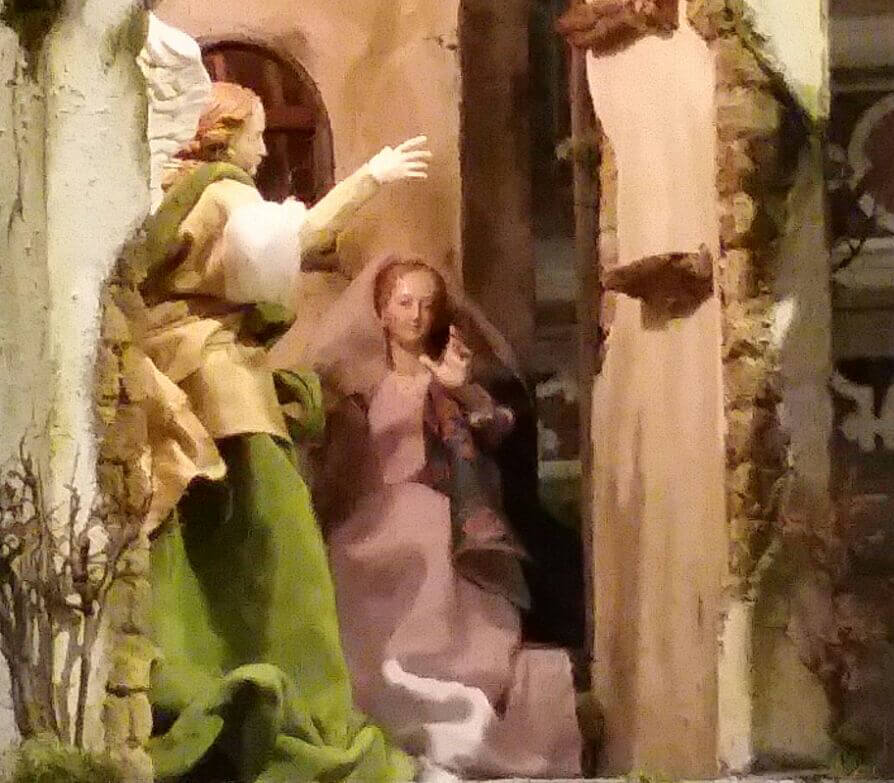 Quest’anno il presepe in stile napoletano della Chiesa di Sant’Anna dei frati Carmelitani Scalzi di Genova si è arricchito di un altra scena riguardante la Nascita di Gesù. Oltre al Santo Mistero, che è la parte centrale del presepe, l’annuncio ai pastori, é stata aggiunta la scena dell’Annunciazione. Maria giovane ragazza nella sua umile casa accoglie l’Angelo che il Signore invia per comunicarle che presto diverrà la Madre del Salvatore. Questo nuovo elemento completa il Mistero arricchendo così questo presepe di stile napoletano a Genova.