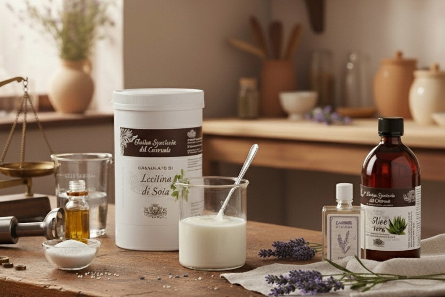 Utilizzeremo anche la Lecitina di Soia granulare, un ingrediente prezioso e multifunzionale. La lecitina è un complesso di fosfolipidi che in cosmetica agisce come un eccellente emulsionante naturale, permettendo di unire in modo stabile la fase acquosa (come il gel di Aloe) e quella oleosa, creando così la consistenza vellutata tipica di un balsamo. Ma le sue virtù non si fermano qui: è un fantastico nutriente e idratante per la pelle. Aiuta infatti a ripristinare la barriera lipidica del derma, previene la disidratazione e lascia la pelle morbida ed elastica. Un autentico dono della natura!