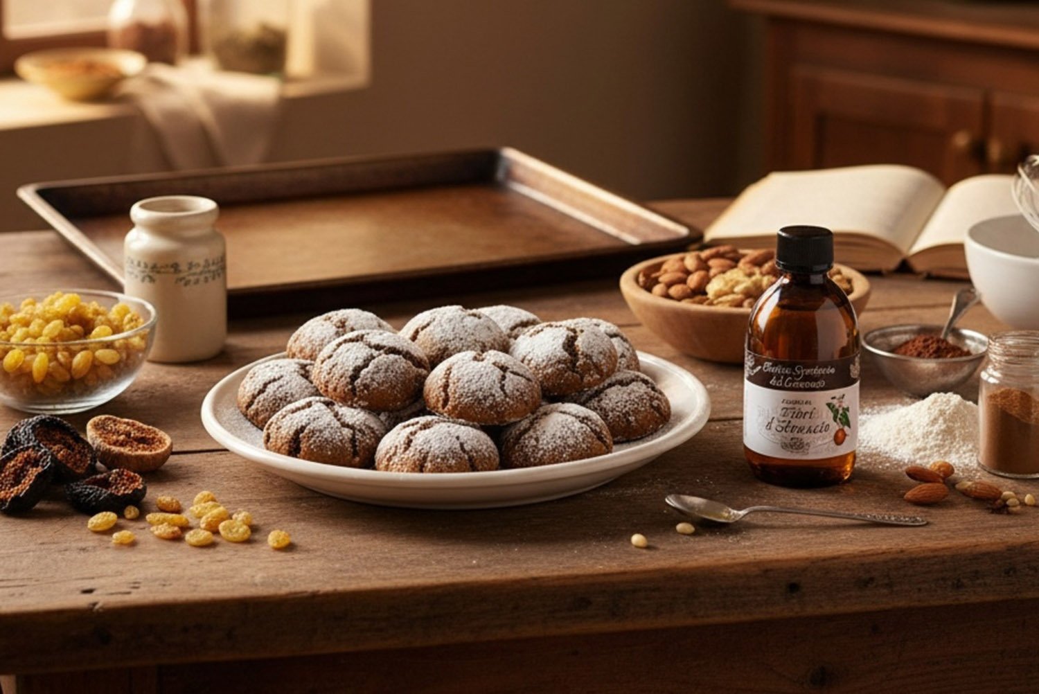 Ingredienti: 200 g di biscotti secchi (tipo frollini, savoiardi o anche amaretti); 100 g di farina 00; 100 g di zucchero semolato; 60 g di uvetta sultanina; 60 g di fichi secchi (tritati grossolanamente); 50 g di mandorle (o un mix di frutta secca come pinoli, noci, nocciole); 20 g di cacao amaro in polvere; 4 albumi d’uovo (circa 120-130 g); 1 cucchiaino di cannella in polvere; 1 pizzico di chiodi di garofano macinati (o noce moscata); 1/2 bustina di lievito per dolci (circa 8 g); 2-3 cucchiai di Acqua di Fiori d’Arancio (regolatevi a seconda dell’umidità dell’impasto); zucchero a velo per la finitura.