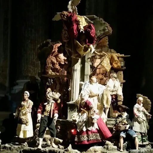 Il Secolo XIX l’ha definito il primo esempio di presepe napoletano in una chiesa genovese, ma questa straordinaria opera è molto di più. L’artista ha commissionato le statuine e la scenografia al maestro Marco Ferrigno, artista napoletano di fama internazionale. Secondo la tradizione napoletana le statuine consistono di testa in terracotta e mani e piedi in legno. Tutto il resto è opera sua. Il corpo lo ha realizzato in filo spinato e canapa, come tradizione vuole. Ha disegnato, cucito e tinto artigianalmente uno ad uno gli abiti delle statuine. I tessuti per i vestiti sono canape, lini, cotoni, taffetà, sete pesanti, velluti e pizzi di fattura antica recuperati per negozi e mercati e poi assemblati pazientemente per dare vita ad un’opera unica che rivela un gusto raffinato e una profonda conoscenza dell’iconografia di genere.